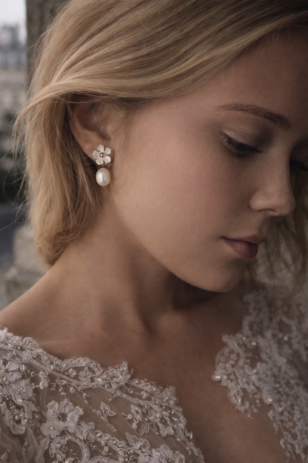 Isla Bridal Crystal Pearl Flower Earrings - Silver