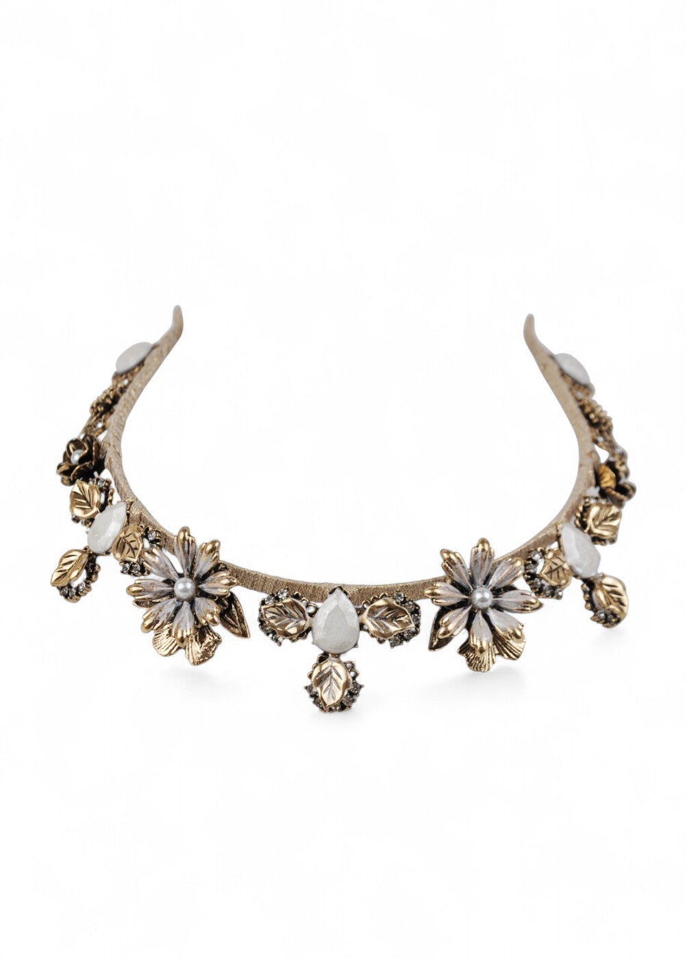 Features hand-painted pearl-like embellishments and intricate vintage gold florals on a lightweight vintage gold headband finished with crystal detailing.