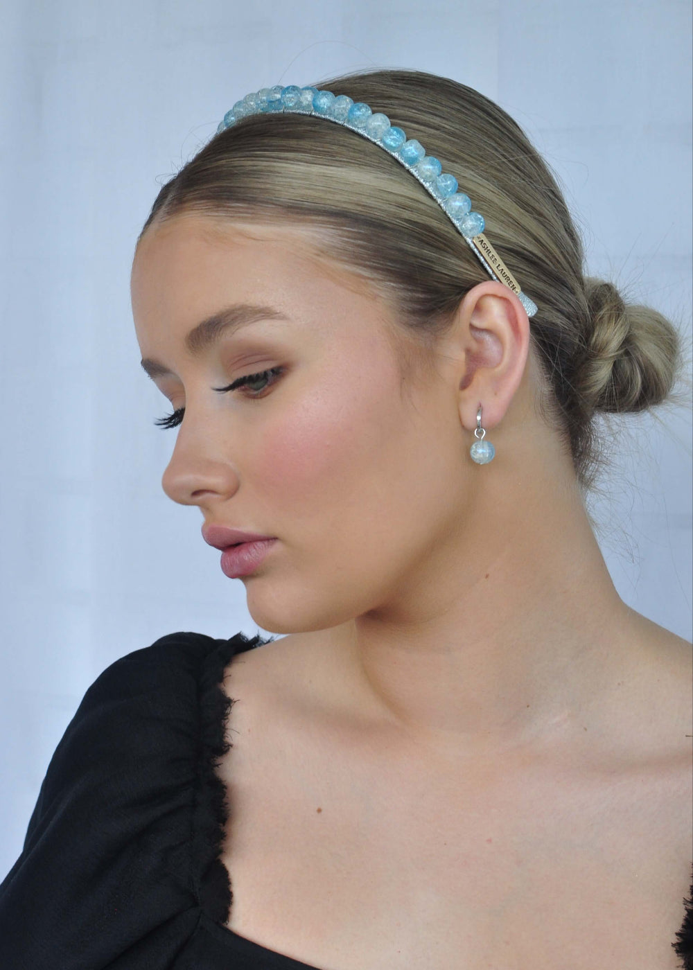 Versatile, elegant, and effortlessly chic—the Hettie Silver and Blue Headband + Huggie Earrings are designed for those who love a personalised touch. The earrings are crafted from beautifully polished Silver, these lightweight huggie earrings feature an interchangeable handmade blue and clear glass marble bead, allowing you to match them perfectly with the Hettie Headband.