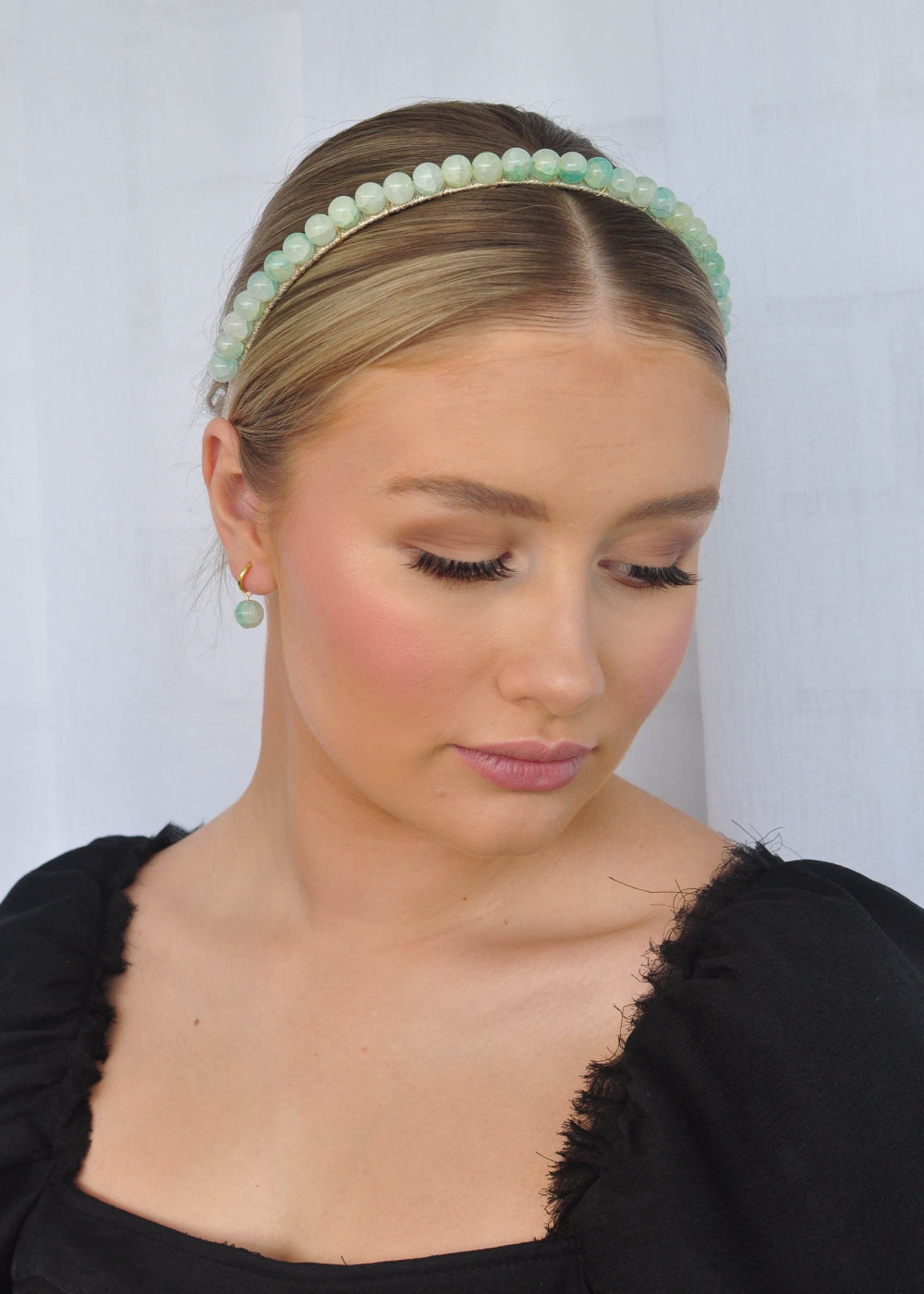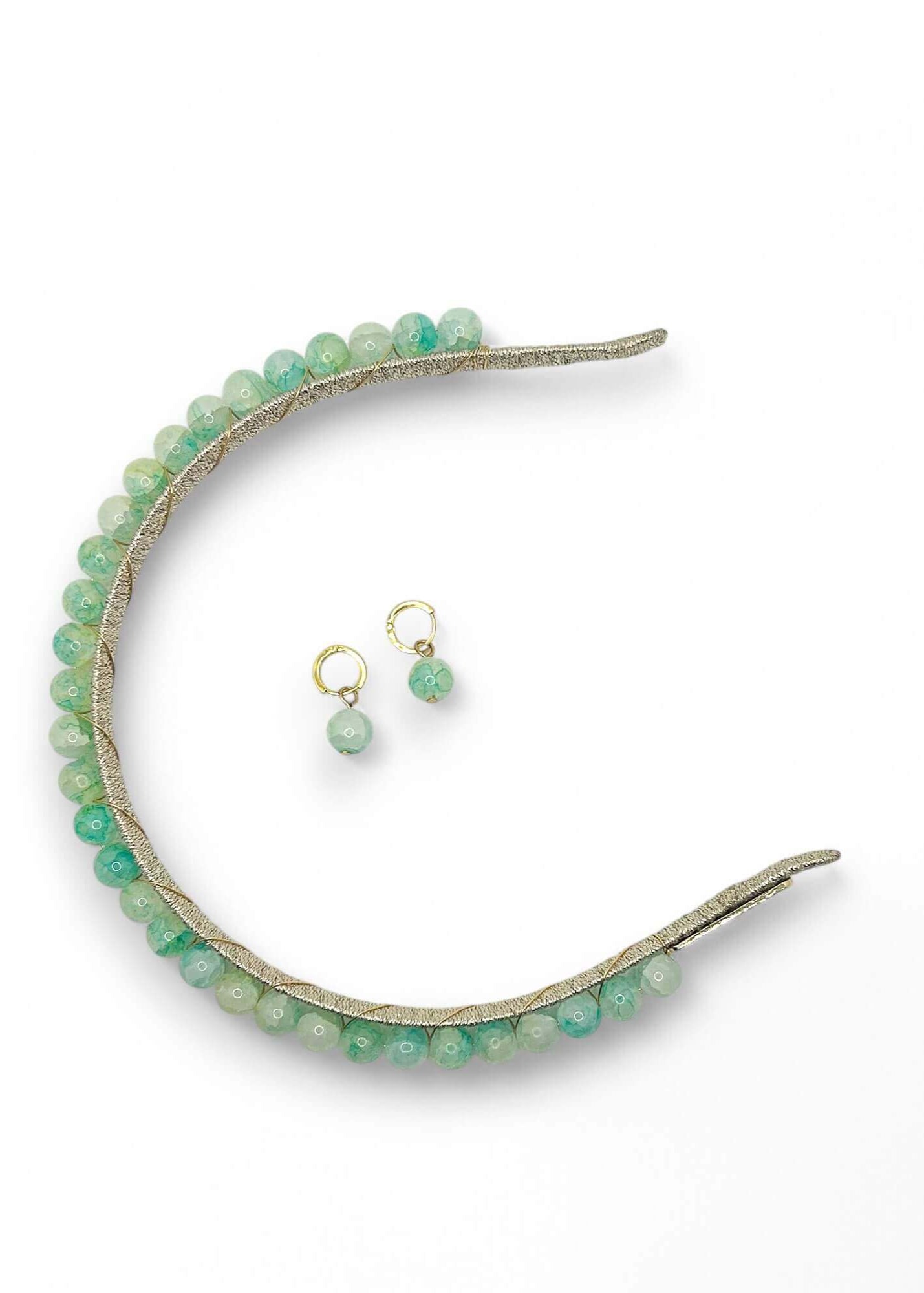 A match made in elegance. The Hettie Set pairs handcrafted details with a modern, effortless edge. Featuring a gold huggie earring with a suspended handmade glass ball and a gold fabric-wrapped headband adorned with swirled mint marbled glass beads, this duo is the perfect balance of statement and sophistication.