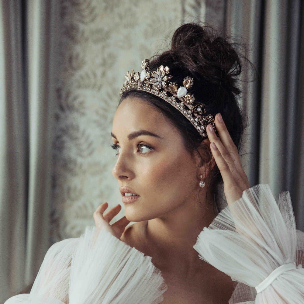 Embrace timeless elegance with the Vintage Lucia Crown. This stunning bridal headpiece combines vintage charm with a modern floral design, creating a breathtaking accessory perfect for the contemporary bride.