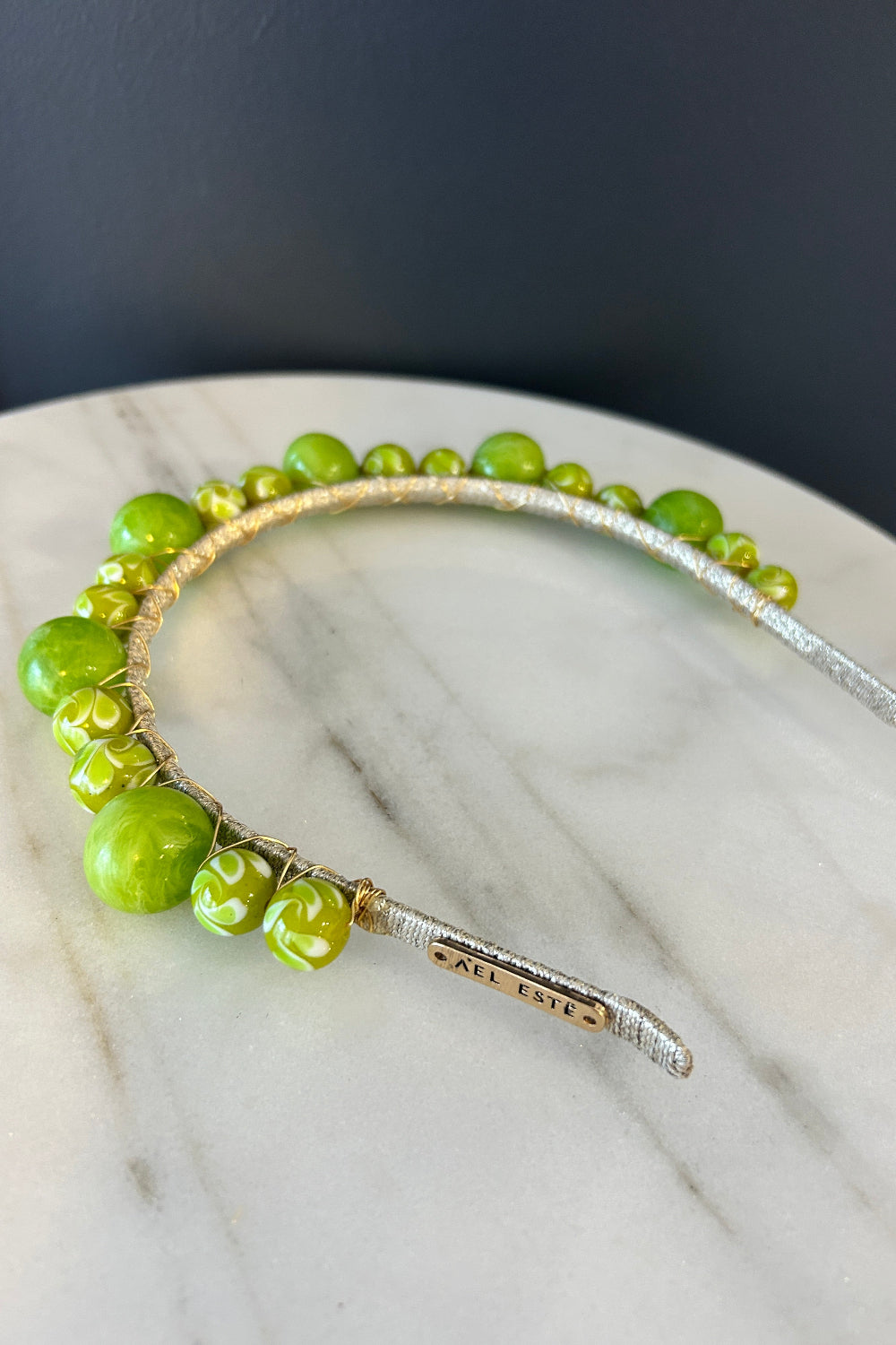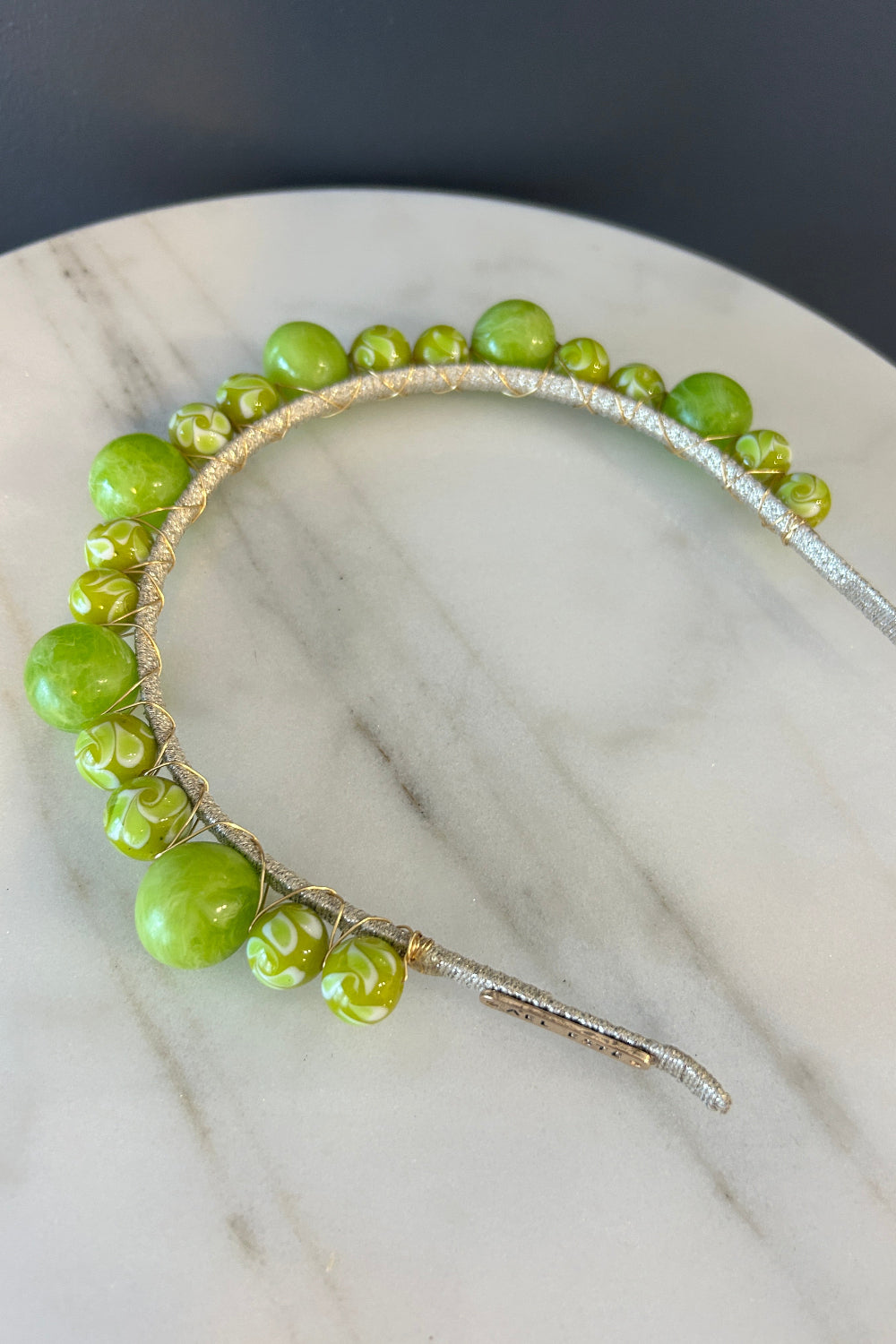 Elevate your look with the stunning Mitta Headband in Green. Handcrafted from premium resin, this headband features a unique marble effect that catches the light beautifully, all while maintaining a sophisticated matte finish. The headband is double-wired onto a gold fleck base, providing both durability and a touch of luxury.
