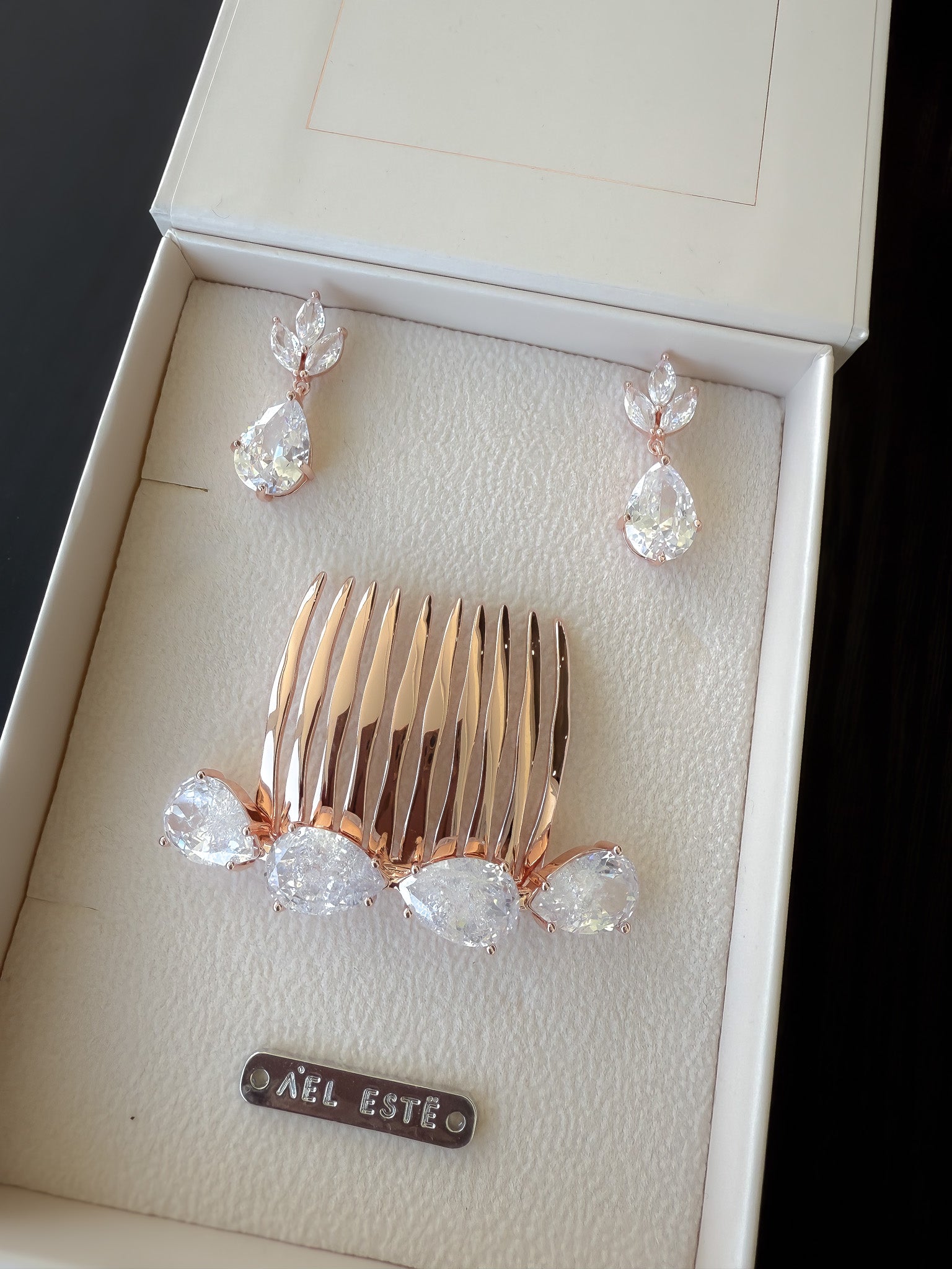 Ravello Crystal Bridal Comb + Earring Set - Rose Gold